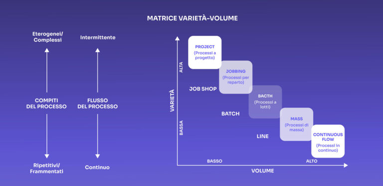 Sull’asse verticale è rappresentata la varietà, che va da bassa ad alta: in alto troviamo prodotti eterogenei e complessi, spesso personalizzati, mentre in basso prodotti standardizzati e ripetitivi. Sull’asse orizzontale è invece indicato il volume, che cresce da sinistra verso destra, passando da produzioni limitate a produzioni di massa o continue.